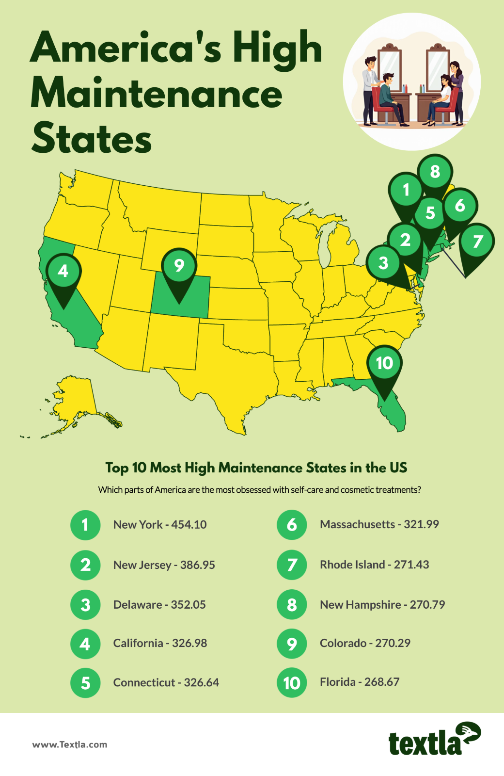 Textla analyzed the number of professionals in six beauty-related categories across all 50 states using a combination of data from Realself, a platform of board-level registered cosmetic specialists, and US and data from the U.S. Bureau of Labour Statistics. We normalized these counts by each state’s population (per 100,000 people), gave them an index score out of 100 in each category, and summed those scores to create a “High Maintenance Score.”